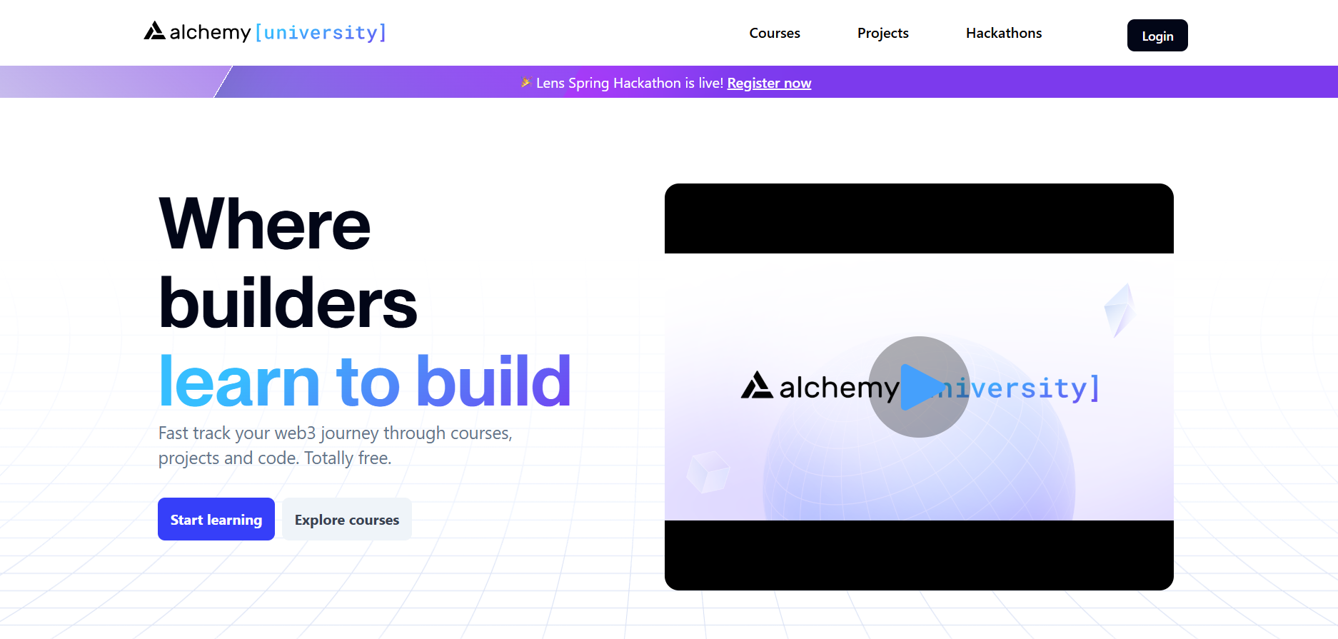 Alchemy University provides a full suite of free Web3 education programs. Their curriculum includes guided projects, interactive coding challenges, and hands-on learning. You can start with their free 3-week JavaScript for Blockchain Beginners course, then advance to their 7-week Ethereum Developer Bootcamp, which covers Solidity and Ethereum development in depth.