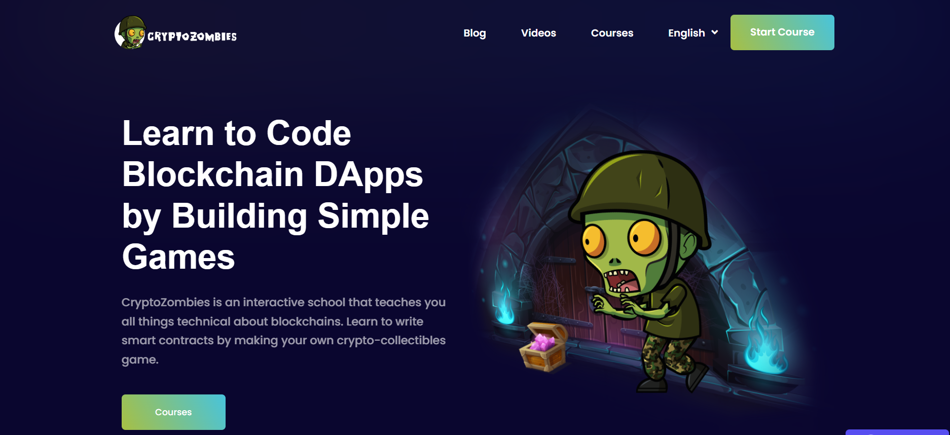 CryptoZombies is an interactive platform that teaches you how to build decentralized applications (dApps). The program is built around creating a zombie-themed video game, where learners progress through interactive, browser-based coding lessons focused on Ethereum and Solidity. With its gamified approach, learning Solidity becomes fun, practical, and easy to grasp even for beginners.
