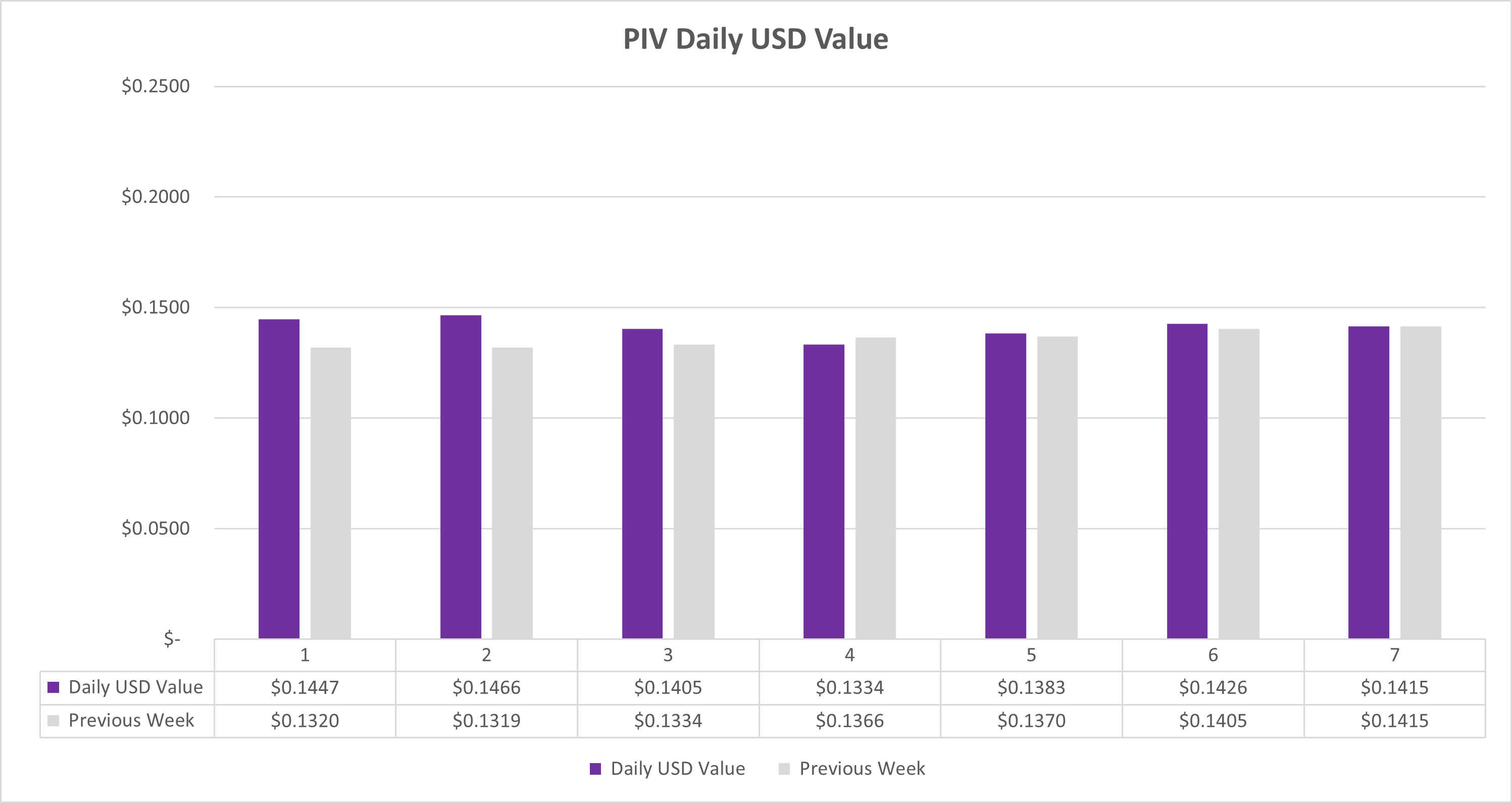 - Price Check: PIVX demonstrated more robust price action this week, with the Daily USD Value trading in a tighter and higher range between $0.13 and $0.15. This positive momentum contributed to an increase in the weekly average price, which climbed to $0.1411 from last week's $0.1361.