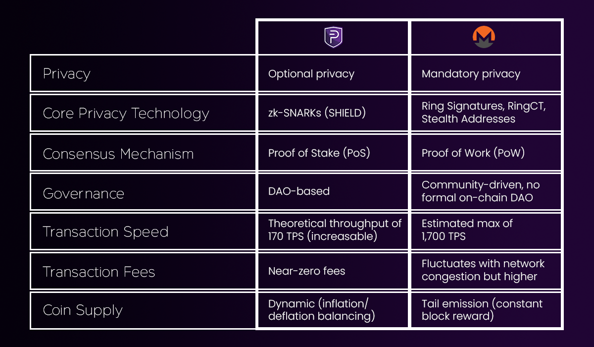 Despite having a shared goal to protect user privacy, Monero and PIVX differ in their approach to privacy, underlying technology, and their network characteristics.
